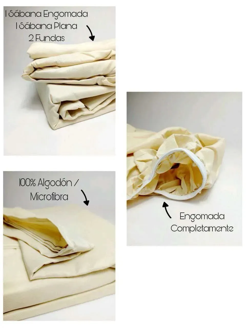 Contiene 4 Piezas, Sábana Plana (203x228cm), Sábana Ajustable (137x190+30cm) 2 Fundas (50x76cm), Completamente Engomada, Textura 100% Algodón y Microfibra.